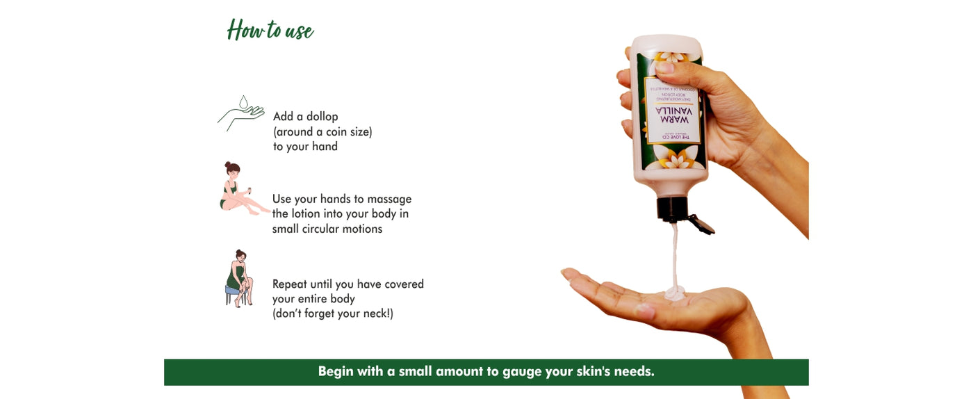 For best results, apply the lotion generously to your body after a bath or shower. Massage it gently into your skin until it is fully absorbed, focusing on dry areas such as elbows and knees.