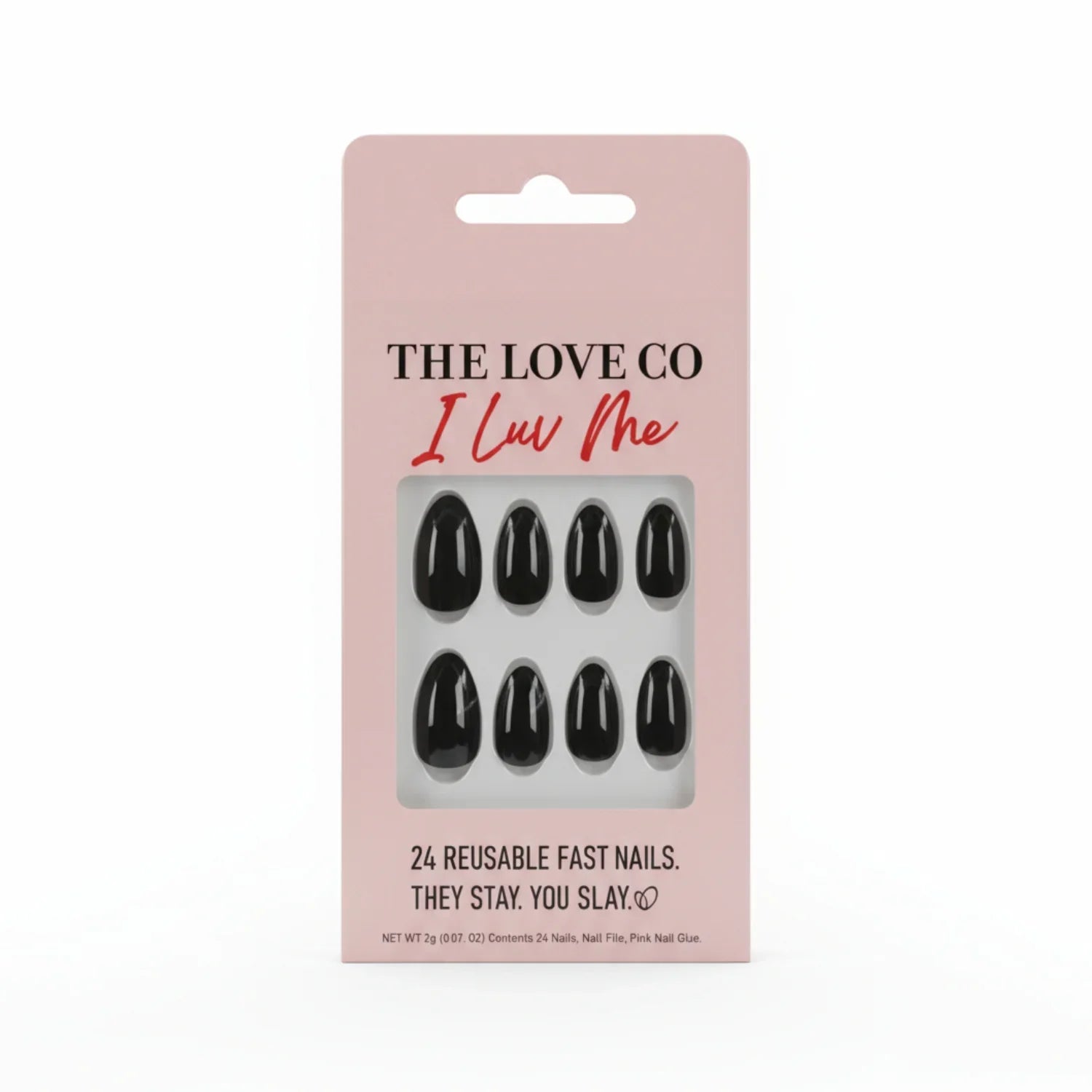 The Love Co I Luv Me black reusable press-on nails set on pink background