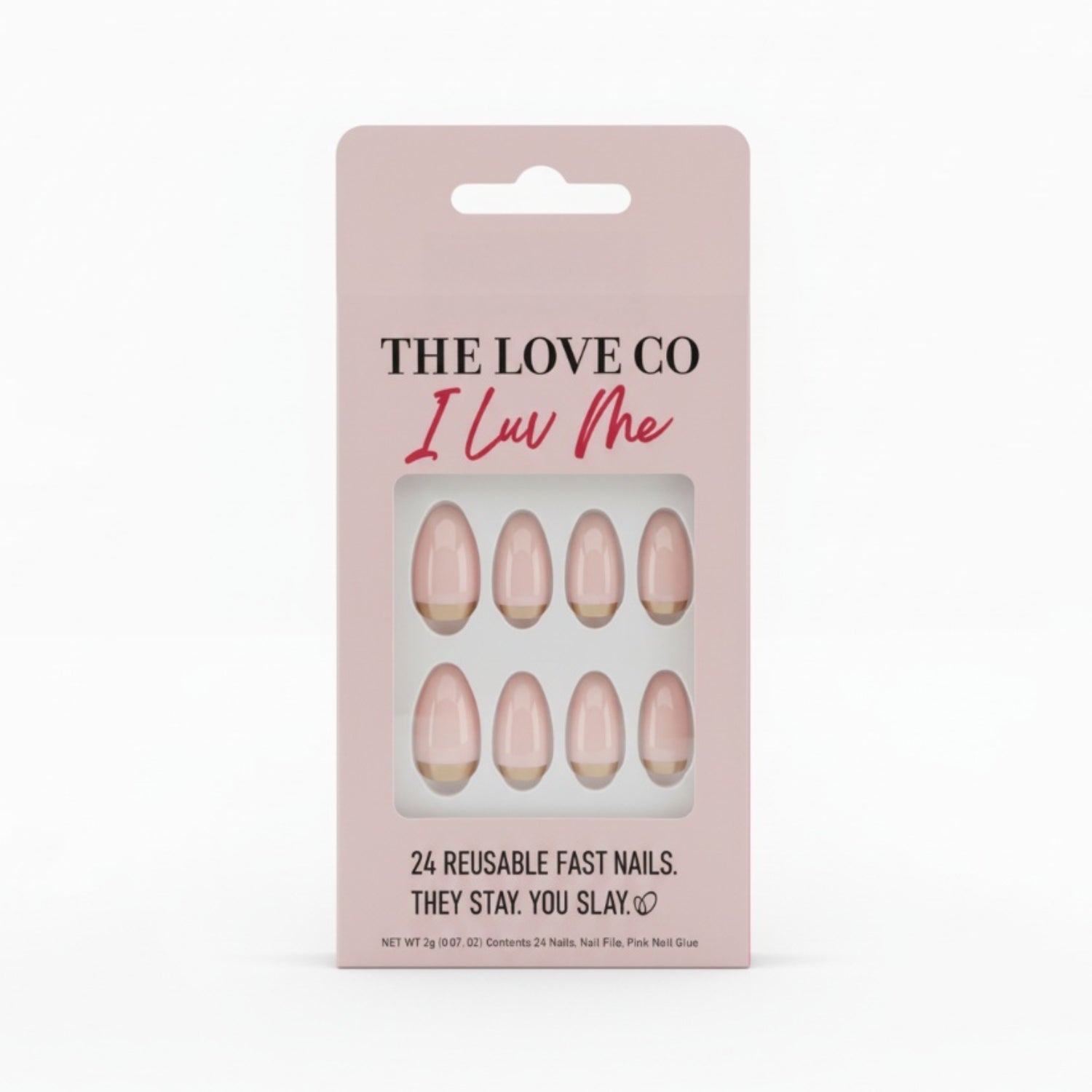 “I Luv Me” by The Love Co is a set of 24 reusable press-on nails featuring a soft nude base with a delicate metallic gold tip in a high-gloss finish. Designed for instant, salon-quality nails — no glue needed, thanks to pre-applied adhesive tabs.