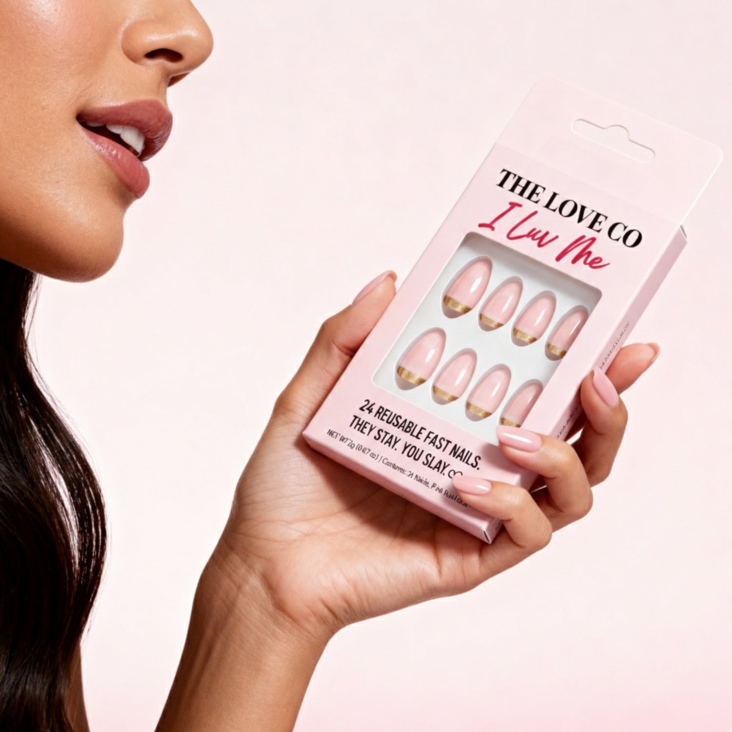 The Love Co’s “I Luv Me” nude press-ons with delicate gold tips are your new secret weapon for effortless elegance — no salon, no glue, no fuss. Just peel, press, and shine.