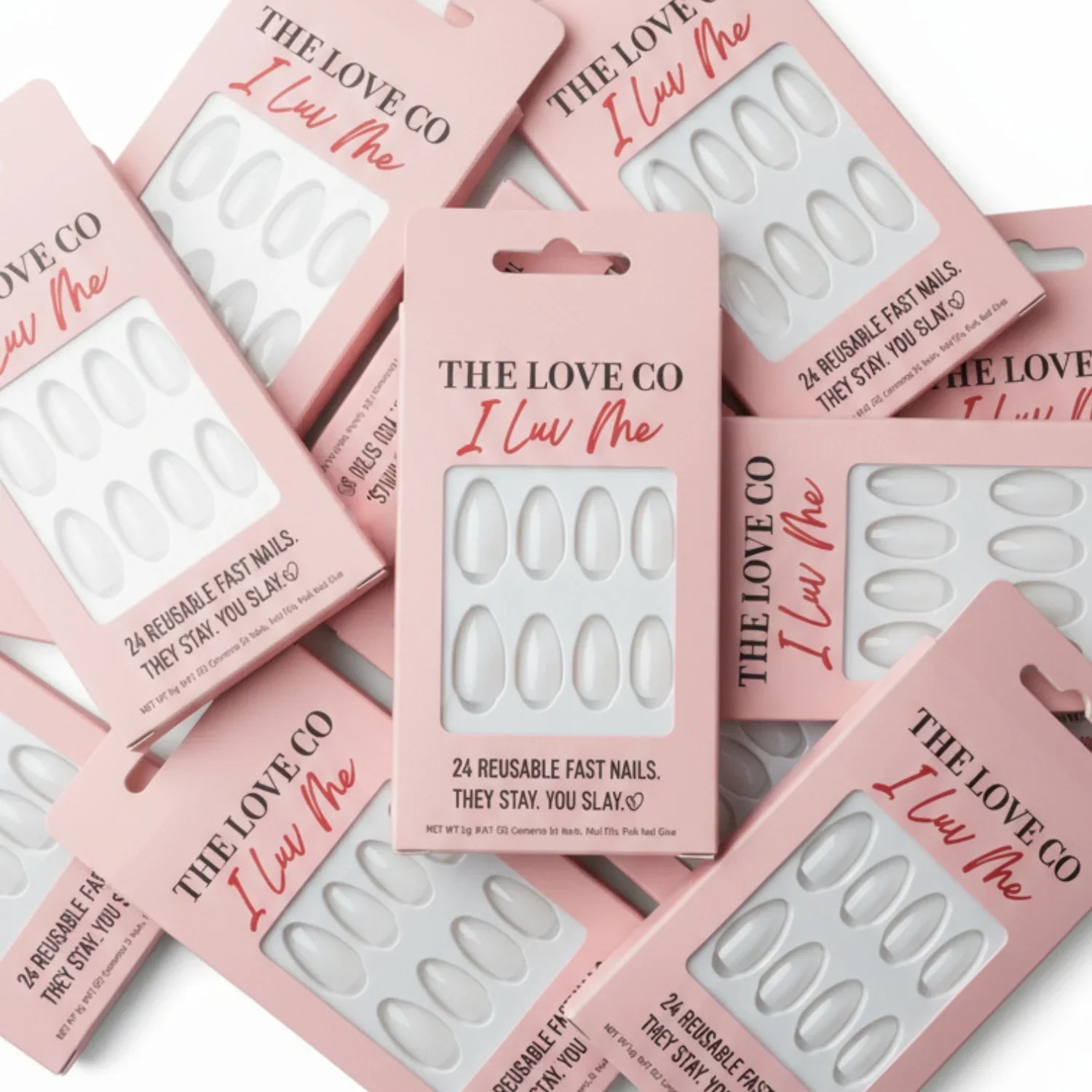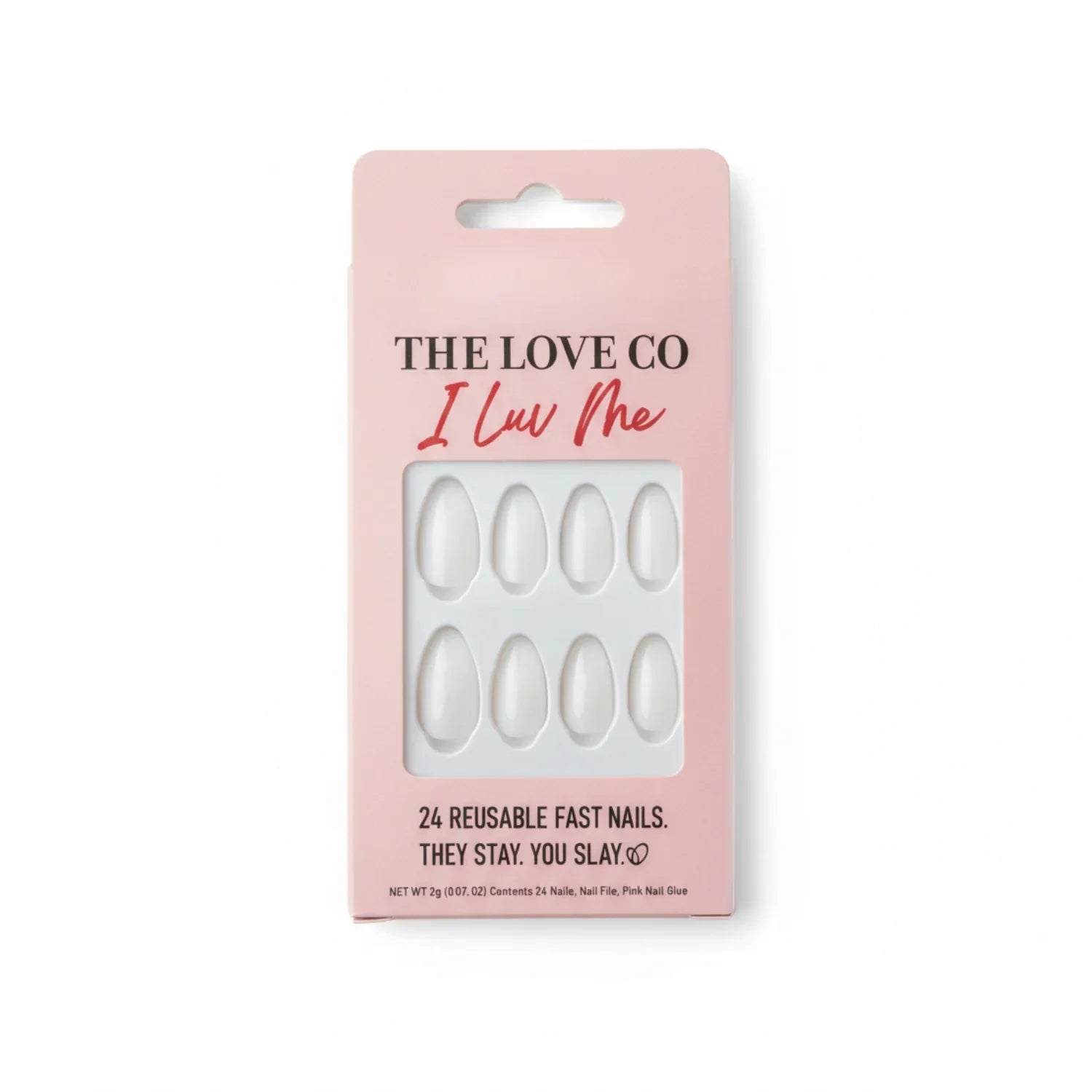 A set of 24 reusable press-on nails in a classic white almond shape, designed for instant, long-wearing glam with pre-applied adhesive tabs.